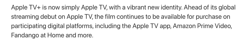 Apple 今日 ( 10 月 13 日)發出新聞稿,公布會在 12 月 12 日(星期五),開始在串流平台上播放,本來此新聞相當普通,每套電影都會有上串流平台的一日。但奇在新聞稿尾段,提到: 「Apple TV+ 將會簡單稱為 Apple TV,藉由這個新的身份,向全球的 Apple TV 發放」。由此公布 Apple TV+ 的名稱將會慢慢淡出,藉以簡化層層疊的月費訂閱與單套電影購買的收費概念。