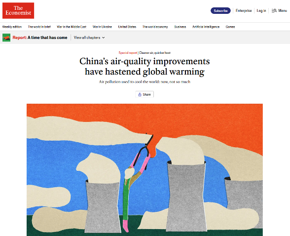 經濟學人》(The Economist)在 2025 年 11 月 3 日刊登《中國的空氣質量改善加速了全球變暖》文章。