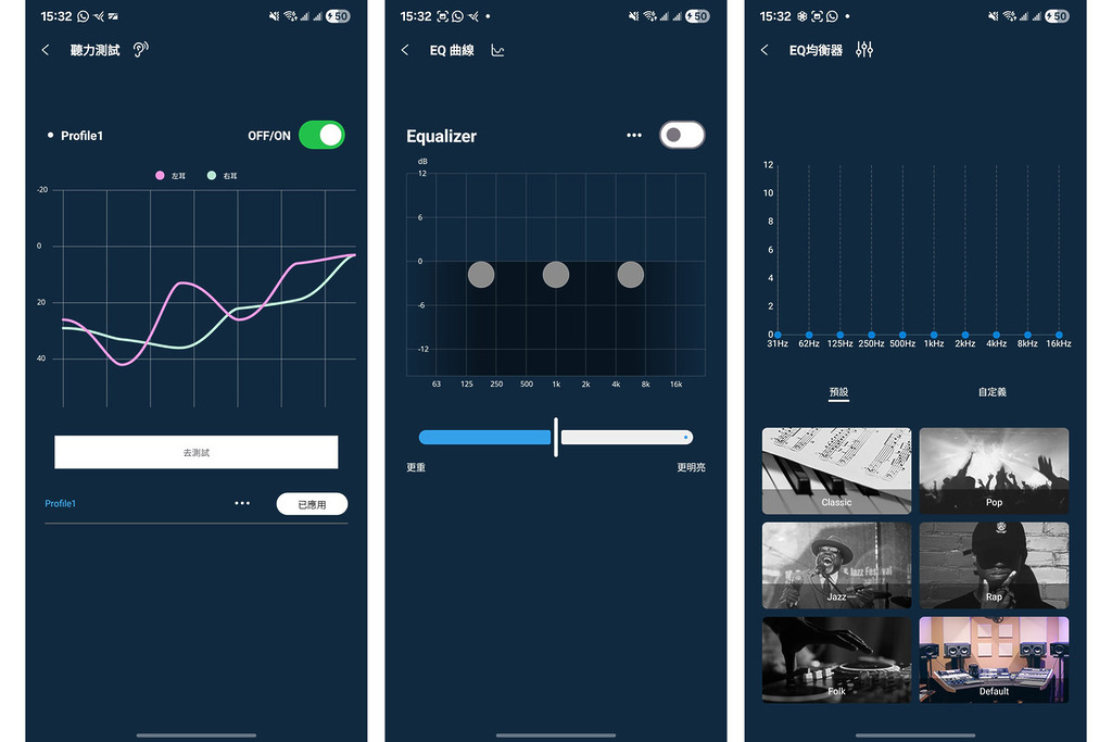 該 APP 操作介面簡潔,支援繁體中文,用戶設置按鍵與降噪模式等功能。