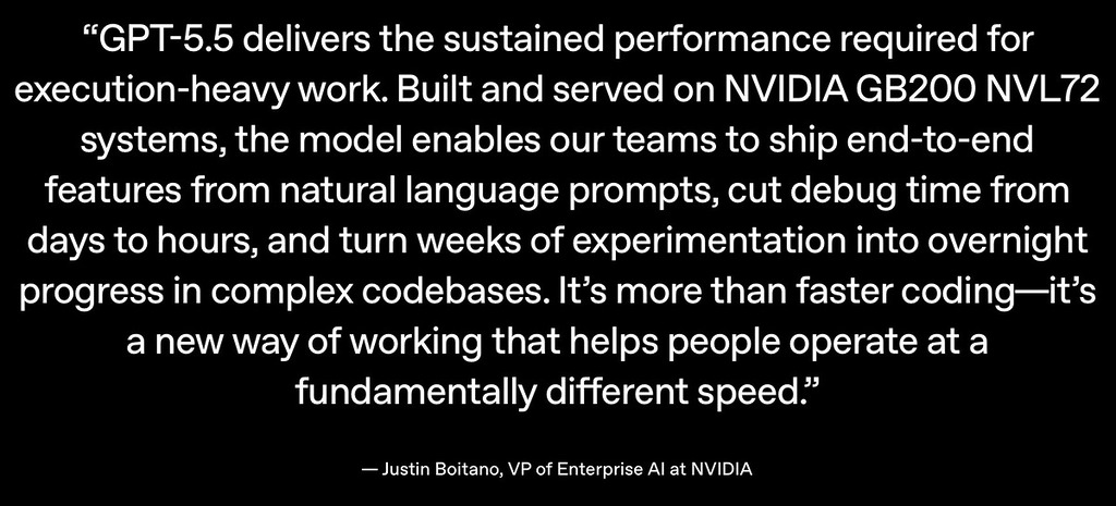 雖然模型變得更聰明,但速度卻沒有變慢。GPT-5.5 維持了與 GPT-5.4 相同的每 Token 延遲時間,甚至在特定任務上效率更高。這歸功於 OpenAI 與 NVIDIA 的深度合作,新模型運行在最新的 NVIDIA GB200 及 GB300 NVL72 系統上。