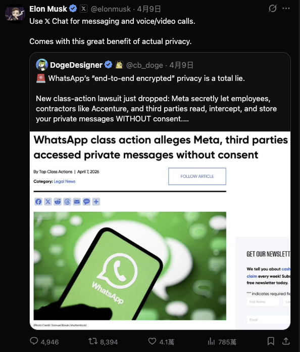 馬斯克(Elon Musk)近萬在 X 平台上連環發炮攻擊 Whatsapp 的私隱問題,原來與傳聞已久的獨立通訊應用程式 XChat 正式曝光有關,這款主打極致隱私與加密的 App,預計將於 2026 年 4 月 17 日正式登場,目標直指 WhatsApp、Signal 及 Telegram。